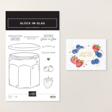 Das Stempelset Glück im Glas verleiht Ihren Papier-Kreationen die Atmosphäre eines bezaubernden Sommertags. Enthalten sind heimelig wirkende Illustrationen sowie Grüße, die von Herzen kommen. Dieses Stempelset ist ideal, um Sonnentage, Freundschaften und kleine Gesten der Freundlichkeit zu feiern. Hausgemachte Leckerbissen werden mit Verpackungen oder Etiketten, die Sie mit diesem Stempelset gestalten, zum echten Hingucker!